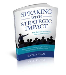 Read all about it in Kate LeVan’s award-winning book, Speaking with Strategic Impact: Four Steps to Extraordinary Presence & Persuasion. It’s a how-to manual for real business people on the executive track.